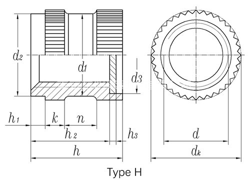 DIN 16903(H) - 1974 滚花通孔中间带槽台阶镶入螺母 带密封垫 H型