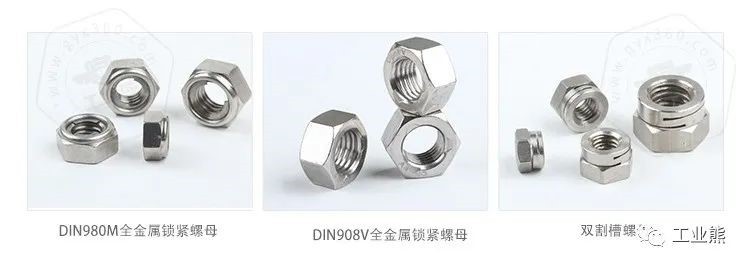 锁紧螺母分为全金属系列锁紧螺母或者非金属嵌件系列锁紧螺母等。全金属系列锁紧螺母,一般会利用螺母变形防松的型式,一般通过割槽的型式,或者挤压螺纹变形的型式,例如法标的双割槽螺母,以及DIN980V锁紧螺母,或者采用螺母顶部加装金属簧片的型式,起到锁紧的作用,例如DIN980M锁紧螺母。